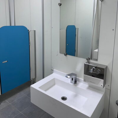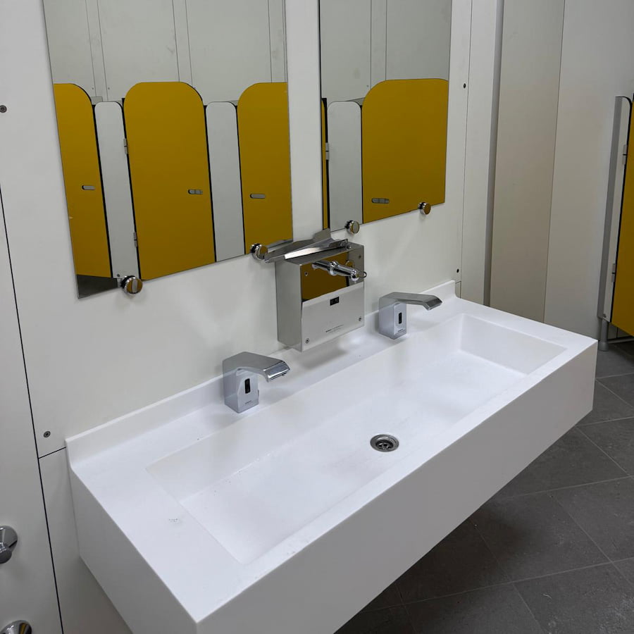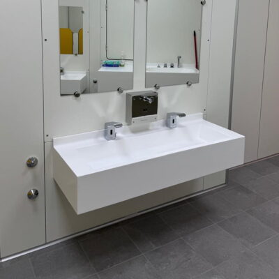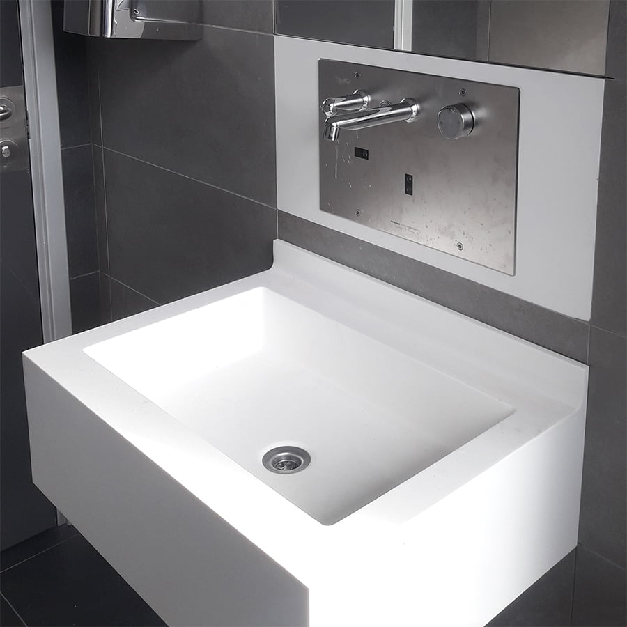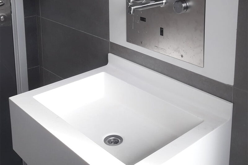 Piani lavabo con anti-debordamento e tamponamenti laterali e frontali di 30cm, particolarmente adatti agli ambulatori, sale parto, nursery e asili nido.